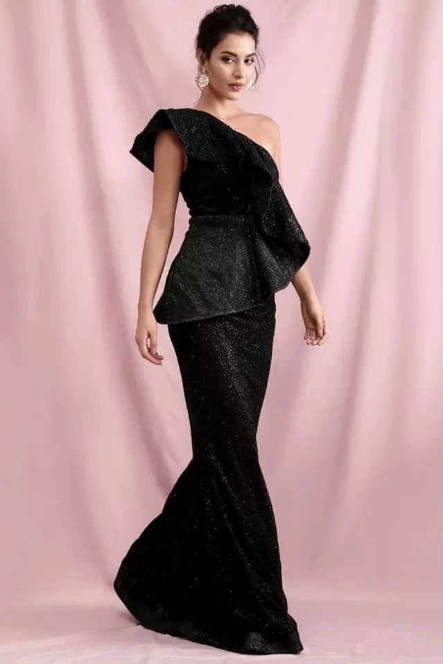 Feel totally dreamy in this glittery gown! Featuring a bodycon fit, a ruffle one shoulder design, and a glittery material. Team this with heels and delicate accessories to look seriously chic for your next occasion!