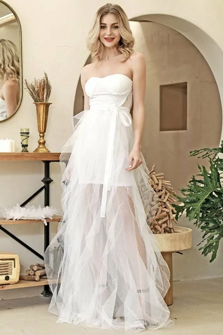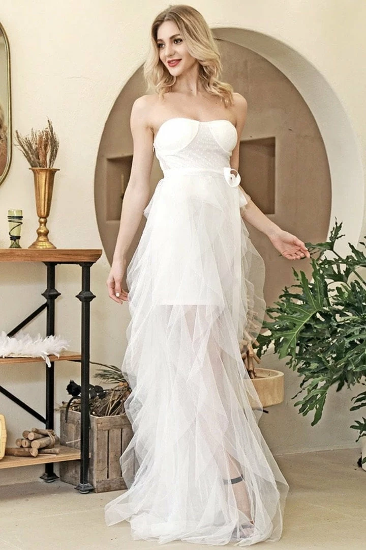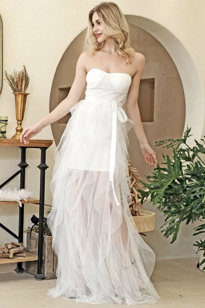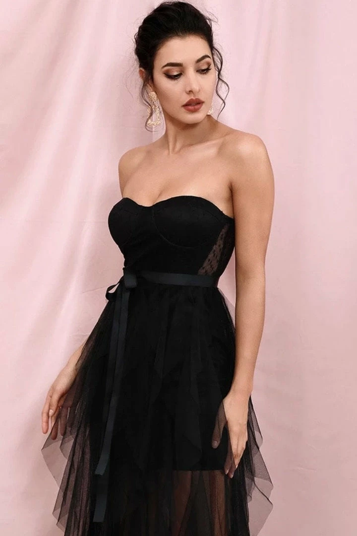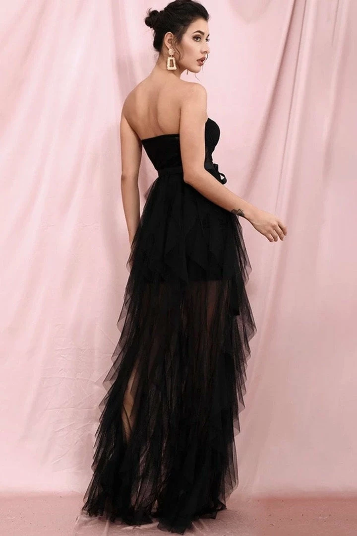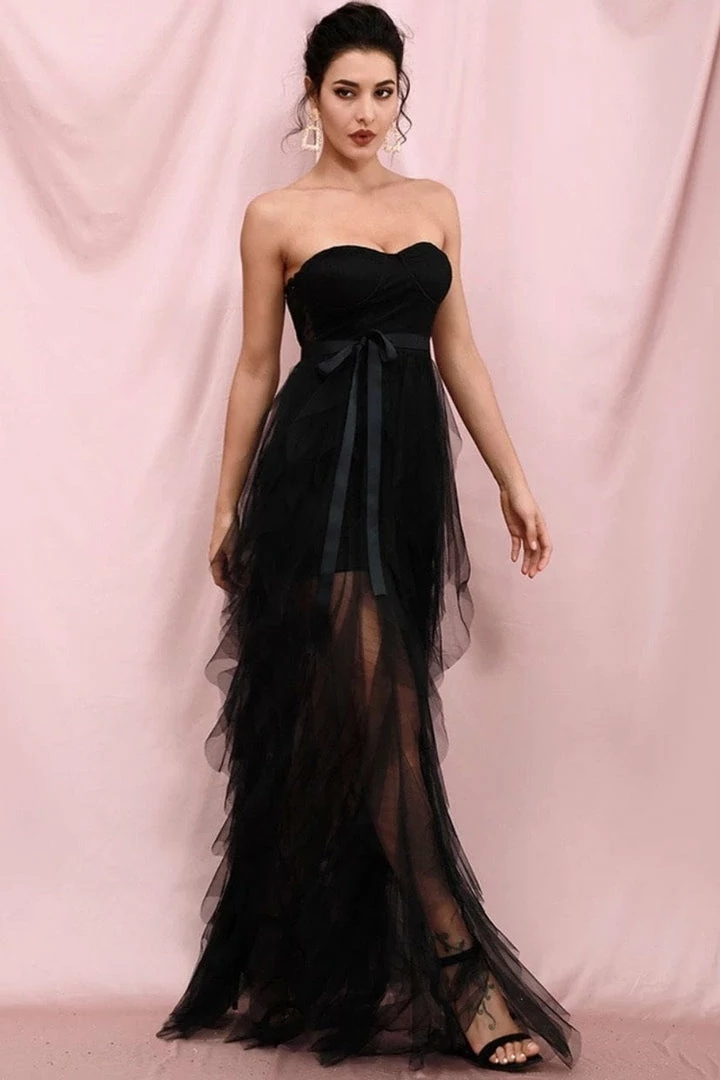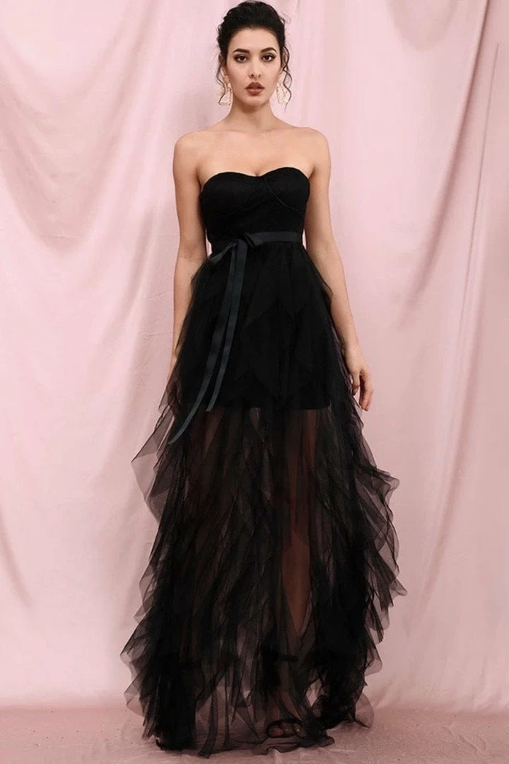 Look like an absolute princess at your next event in this gorgeous piece. Featuring a strapless style, belted waist, sheer tulle material, and a maxi length. Pair with statement earrings and a rhinestone clutch.