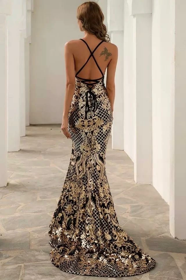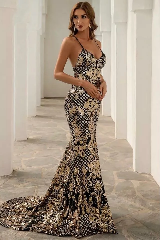 Walk into the event turning heads with this stunning sequin gown. Featuring thin straps, a strappy backless design, a leg slit, and a glamorous train. Add simple small accessories for the dream look!