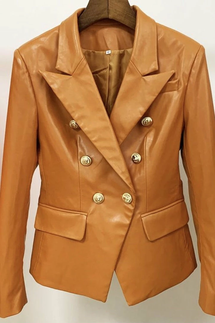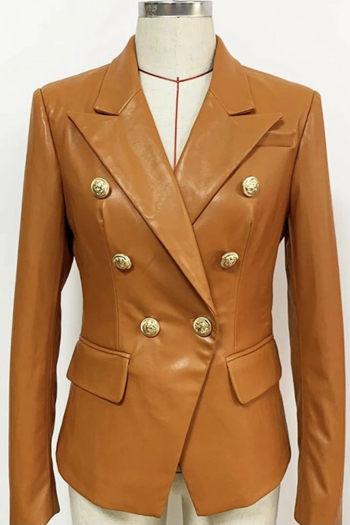 This double breasted faux leather blazer is complete with gold, detailed buttons. Top off any look with our Margaux Blazer and your favorite gold jewelry to instantly elevate it!