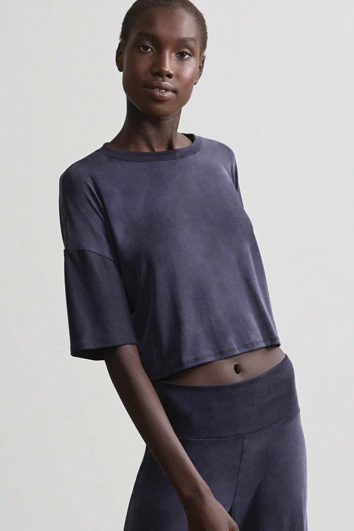 Lounge in style with our Vegan Silk Boxy Tee. This oversized crew neck tee is made using recycled cotton linter fibers that have the look and feel of real silk.