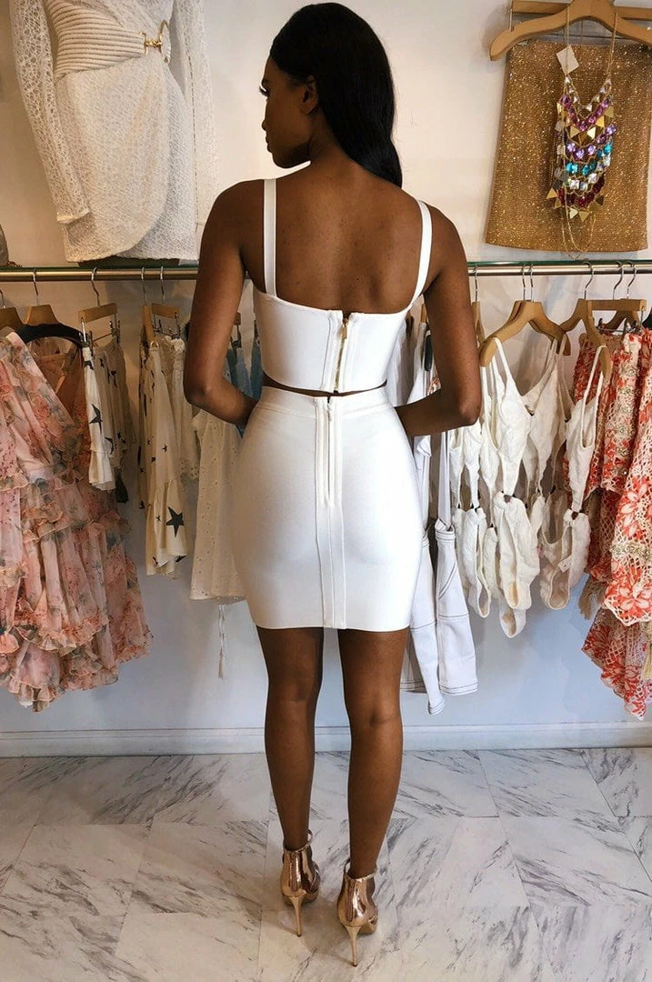 We are obsessing over this summer white two-piece outfit. Including a crop top and matching mini skirt with button details, just pair with strappy heels for a night out.